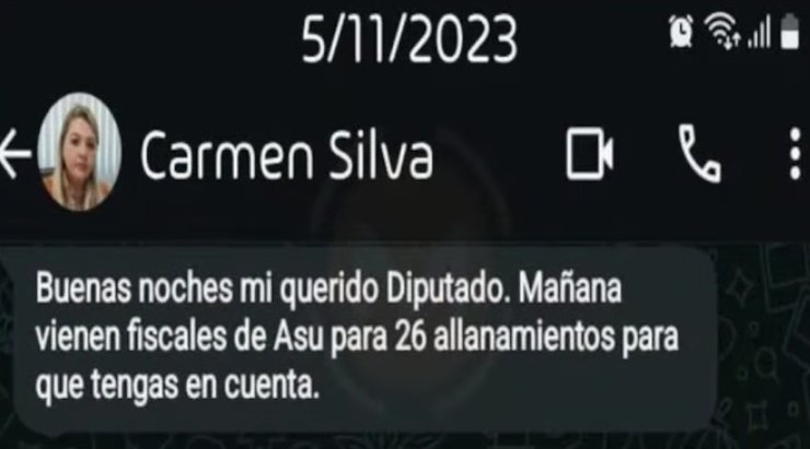Según chats de la jueza Carmen Silva con el diputado fallecido Eulalio «Lalo» Gómes, esta habría advertido con antelación al legislador sobre un operativo en el que fiscales realizarían 26 allanamientos en busca de bienes vinculados al narcotraficante Jarvis Chimenes Pavão.