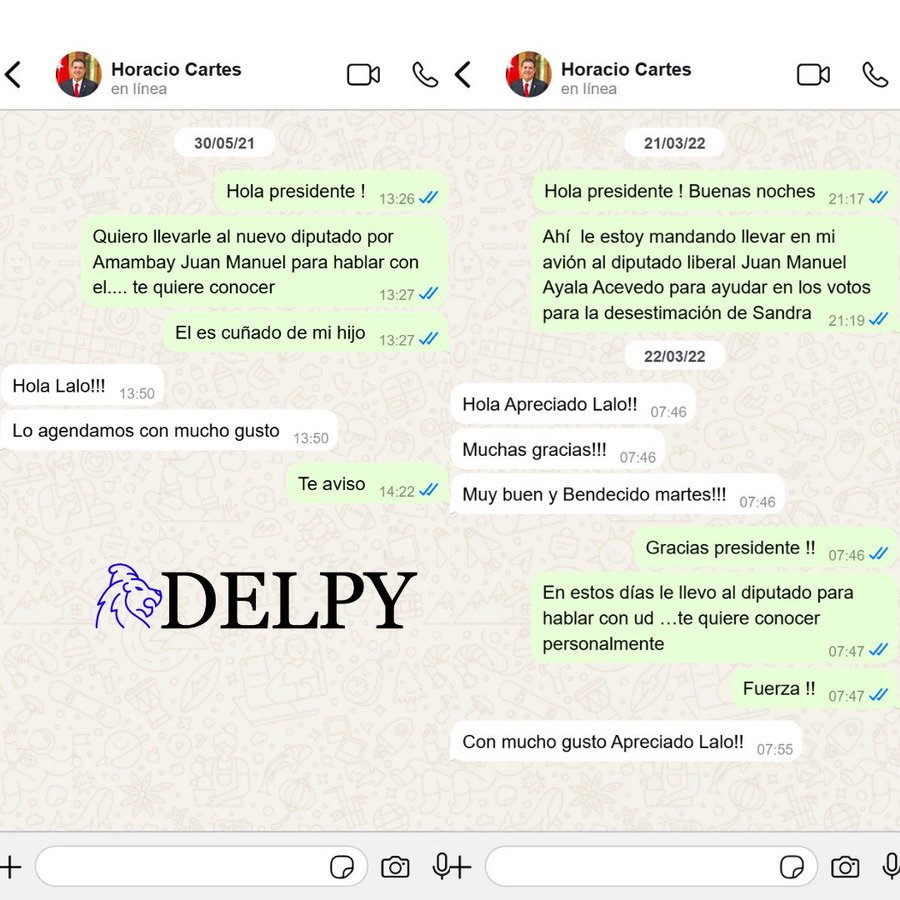 En una conversación fechada el 21 de marzo de 2022, Gómez le dice a Cartes: “Ahí le estoy mandando llevar en mi avión al diputado liberal Juan Manuel Ayala Acevedo para ayudar en los votos para la desestimación de Sandra”.