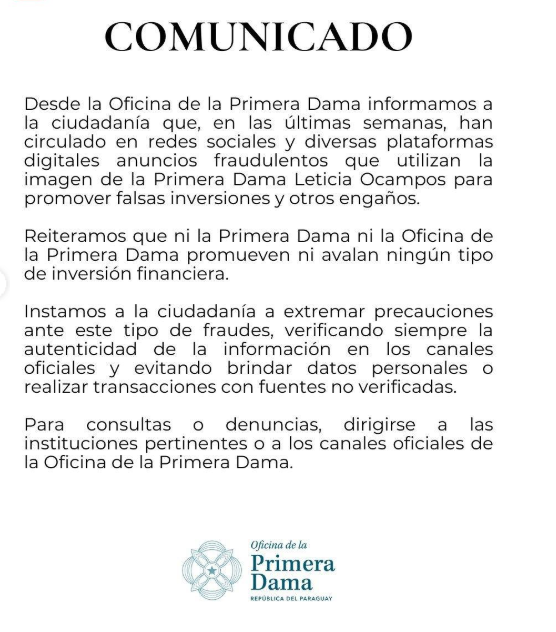 La Oficina de la Primera Dama de Paraguay emitió un comunicado advirtiendo a la ciudadanía sobre la circulación de anuncios fraudulentos en redes sociales y plataformas digitales. Estos anuncios utilizan la imagen de la Primera Dama, Leticia Ocampos, para promover falsas inversiones y otros engaños.