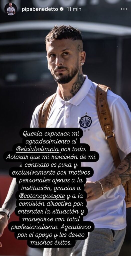 «Quería expresar mi agradecimiento al club Olimpia por todo. Aclarar que la rescisión de mi contrato es pura y exclusivamente por motivos personales, ajenas a la institución», aseguró en «Pipa» en su cuenta de Instagram.
