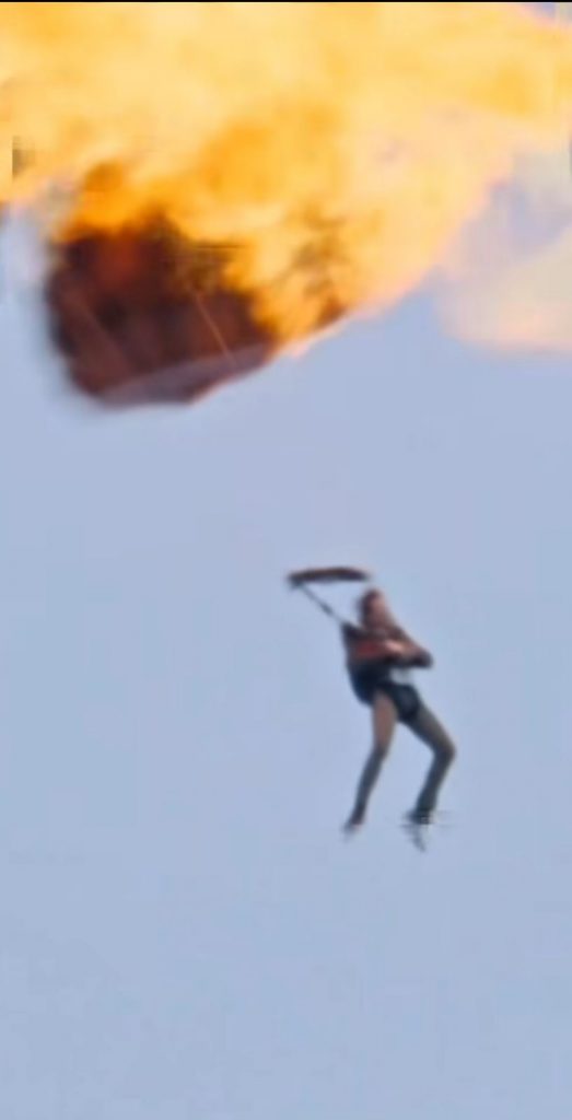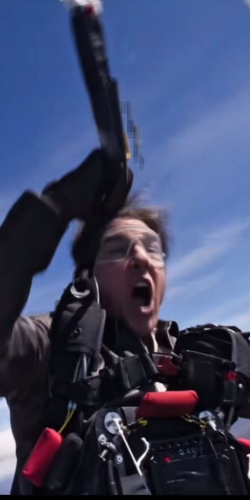 En esta impactante escena, Cruise interpreta a Ethan Hunt, quien, tras una batalla final a bordo de un avión fuera de control, debe saltar al vacío con un paracaídas que, al desplegarse, se prende en llamas. Con una templanza digna del personaje, corta el paracaídas incendiado y activa uno de repuesto para aterrizar a salvo.