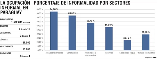 Aunque el dato representa un ligero aumento respecto a 2023 (62,1%), la cifra alerta sobre la vulnerabilidad económica de miles de familias que viven al margen del sistema laboral formal. El servicio doméstico y la construcción encabezan los rubros más afectados por esta situación estructural.
