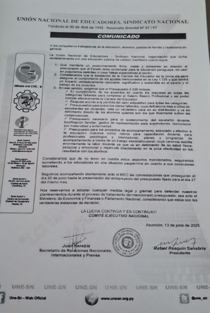 En charla con la radio 780 AM, Rafael Resquín, secretario general de la Unión Nacional de Educadores, sostuvo que estamos en una coyuntura ya acostumbrada y todos los años pasa lo mismo, refiriéndose a la poca predisposición del Gobierno para invertir más en el sector y apuntar eso como una política pública.