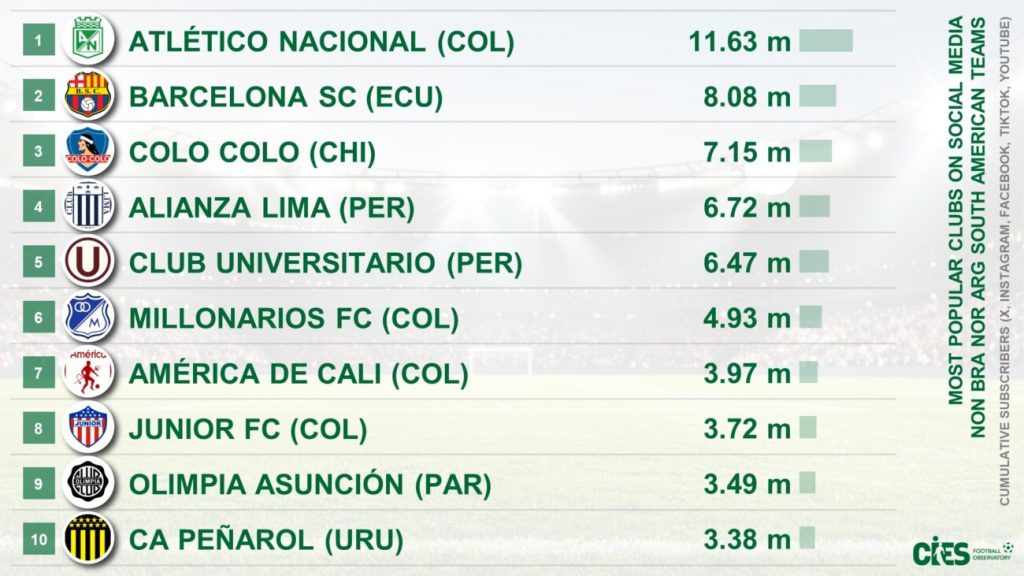 Sacando a equipos de Argentina y Brasil, Olimpia se encuentra en la novena posición como uno de los más populares con una cantidad total de 3.49 millones de suscriptores contando todas las redes sociales mencionadas.