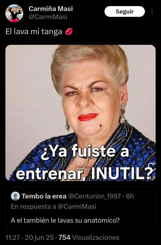 Lejos de ignorar el comentario, Carmiña respondió con un giro inesperado: “Él lava mi tanga”, acompañado de un meme de Paquita la del Barrio diciendo: “¿Ya fuiste a entrenar, inútil?”.