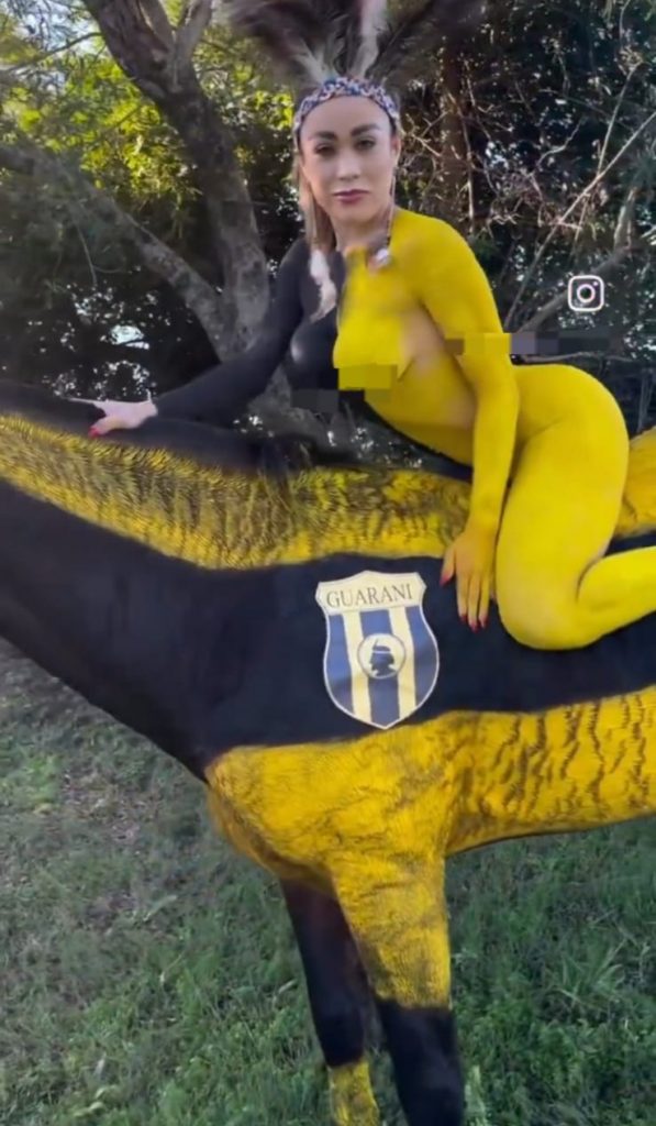 La polémica se generó luego de que la mujer cumpliera una promesa a los hinchas del club Guaraní realizando una sesión fotográfica con body painting, donde no solo su cuerpo fue intervenido, sino también un caballo.