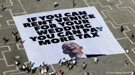 La ceremonia que tendrá lugar entre el 26 y el 28 de junio ha generado una verdadera tormenta en la icónica ciudad italiana. Con cierres temporales de calles, canales y espacios históricos, los residentes han manifestado su rechazo. Una comparsa satírica con carteles como “En vez de gastar millones, ¡paga impuestos!” recorrió las calles, dejando en evidencia la tensión entre el glamour del evento y las preocupaciones sociales.