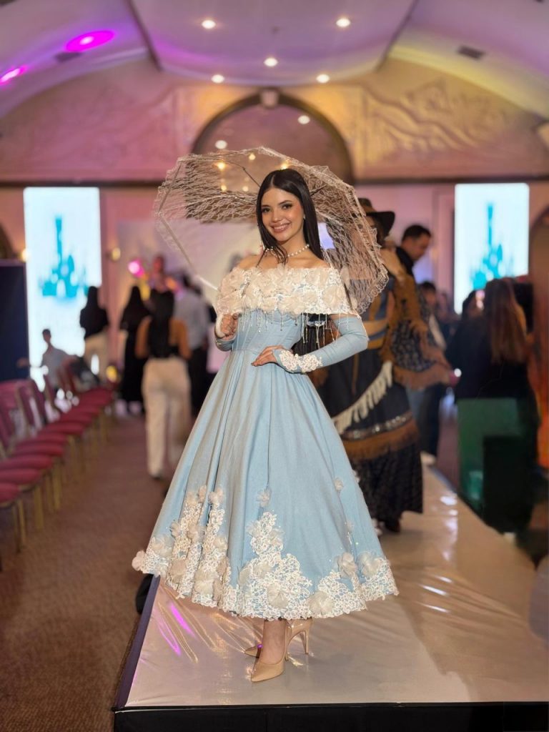 La protagonista fue Nicole Samara Feltes Cano, actual Reina Teen Caaguazú y candidata oficial a Reinas Teens del Paraguay 2025–2026, quien dejó sin palabras al público al desfilar con un vestido vintage de alto impacto, creado con:
