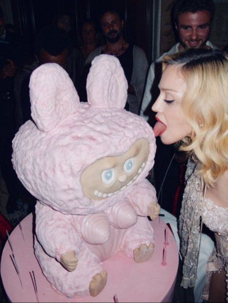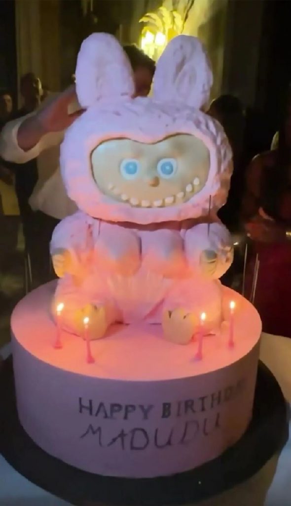 Uno de los momentos más comentados fue la llegada de un pastel gigante color rosa inspirado en Labubu, el famoso personaje asiático de colección. Con un corsé satinado blanco, Madonna sopló las velas mientras todos coreaban: “Happy Birthday Madudu”.