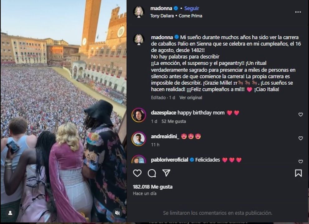 La cantante eligió Siena para presenciar en vivo el Palio, la histórica carrera de caballos que se realiza desde 1482. “¡Un ritual verdaderamente sagrado!”, escribió la artista al compartir un reel en Instagram que ya superó millones de reproducciones.