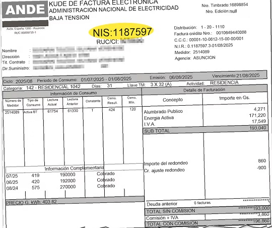 El NIS es un código único de siete dígitos impreso en la parte superior de la factura de la ANDE. “Es como la cédula de identidad de cada usuario”, explicó la empresa en su comunicación oficial, destacando que este dato permite identificar de manera exacta cada inmueble conectado al sistema eléctrico nacional.