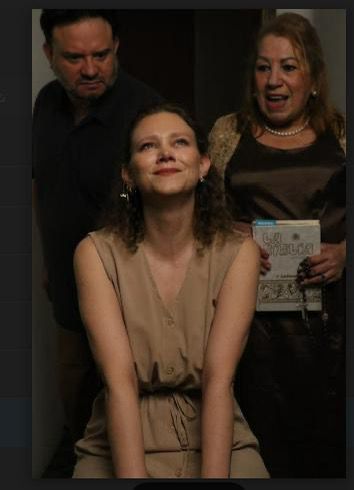 La protagonista es interpretada por Crhys Knapp, actriz con amplia trayectoria en teatro y cine, acompañada en escena por Teresa Barriocanal y Seba Díaz, quienes encarnan con intensidad a los antagonistas (la abuela y el exmarido). El elenco se preparó de manera rigurosa para abordar esta obra sensible, incorporando técnicas de memoria afectiva, ejercicios de improvisación y acompañamiento de profesionales de la salud mental, garantizando un proceso ético, responsable y respetuoso.