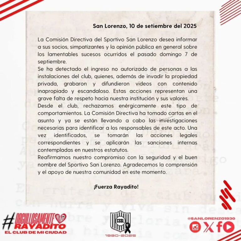 En este sentido, la Comisión Directiva informó a través de un comunicado que está al tando de lo acontecido el 7 de septiembre pasado, cuando se detectó «el ingreso no autorizado» de extraños al club, quienes «además de invadir propiedad privada», «grabaron y difundieron vídeos con contenido inapropiado y escandaloso».
