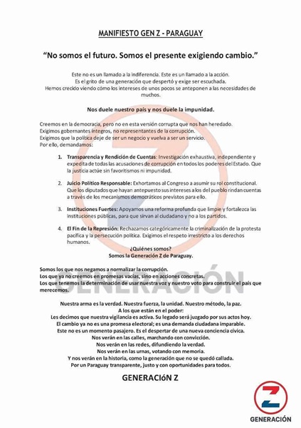 El grupo juvenil autodenominado GEN Z Paraguay anunció una manifestación para el 28 de septiembre frente al Congreso Nacional. La convocatoria generó un operativo de prevención y monitoreo por parte de la Policía Nacional.
