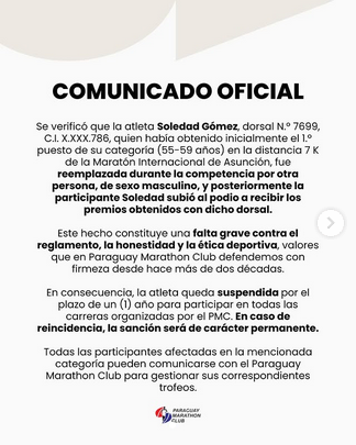 Este hecho «constituye una falta grave contra el reglamento, honestidad y la ética deportiva, valores que en Paraguay Marathon Club defendemos con firmeza desde hace más de dos décadas», alega el documento.