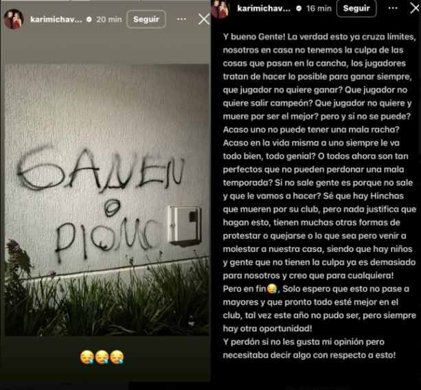 «Y bueno gente, la verdad que esto ya cruza límites, nosotros en casa no tenemos la culpa de las cosas que pasan en la cancha, los jugadores hacen lo posible para intentar ganar siempre» dice parte del descargo de la esposa de González.