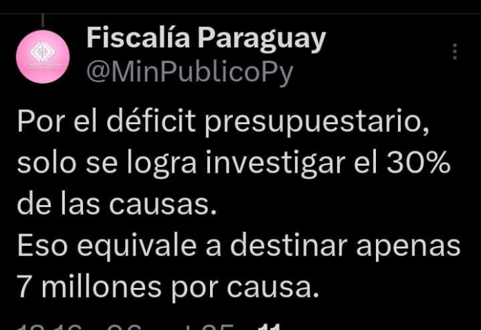 “Si dividimos el presupuesto total 2024 (G. 672.000 millones) entre las 310.927 causas ingresadas, 7 de cada 10 causas quedan sin respuesta. Investigar una causa penal, desde el inicio hasta su conclusión, cuesta en promedio G. 90 millones”, señala la publicación oficial del Ministerio Público.