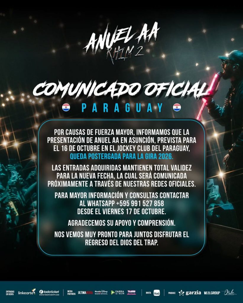 Por causas de fuerza mayor, el esperado concierto del artista urbano Anuel AA, previsto para el jueves 16 de octubre en el Jockey Club Paraguayo, fue postergado para la gira 2026.