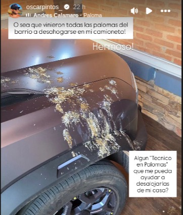 Mostró la foto de cómo amanece su camioneta, bañada con el «popó» de las palomas. Pidió que le ayuden con algún consejo o contacto de algún especialista en situación de crisis por invasión de estas aves que, para algunos, son tiernas y para otros, como él, son molestosas y perjudiciales.