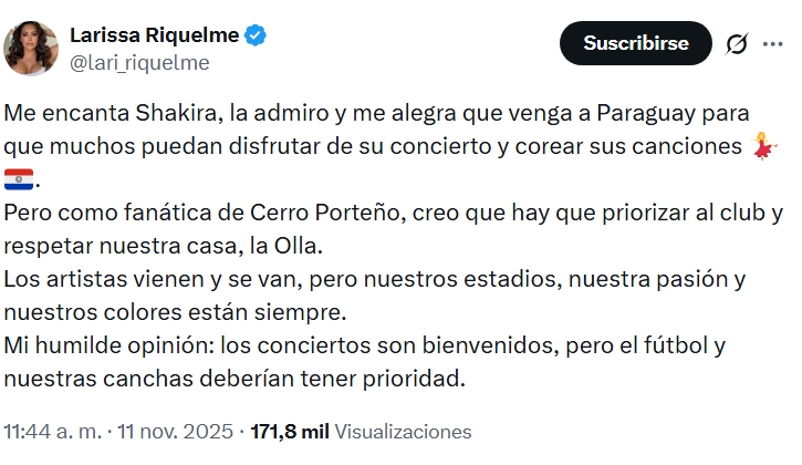 Cuando todavía no se decidía si Cerro Porteño jugaría o no en La Nueva Olla su próximo partido ante Libertad, por el contrato que tiene el club con la productora que organiza el concierto de Shakira, Larissa se pronunció haciendo saber qué prefiere ella.