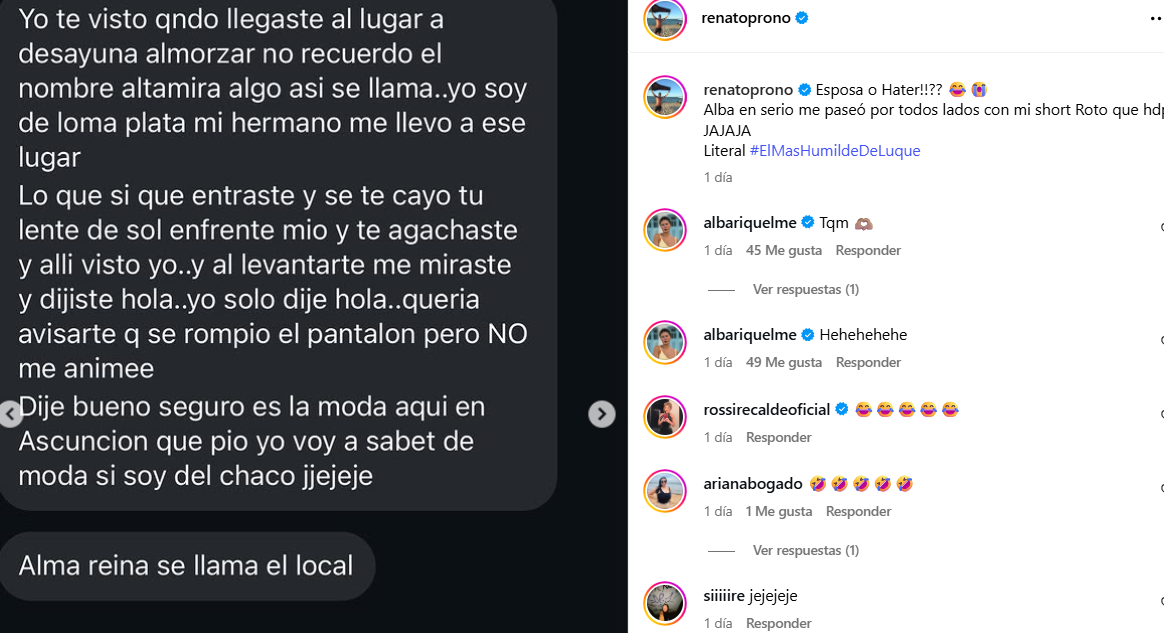 El influener Renato Prono salió a pasearse el domingo con un short roto, sin saber. El amor de su vida, Alba Riquelme, le hizo a propósito, para reirse de él y para «quemarle» ante la gente.