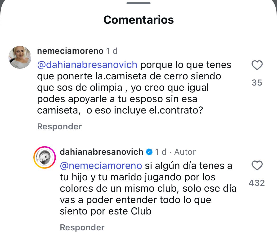 Y entre los comentarios, una mujer le criticó por ponerse la camiseta de Cerro, a lo que Dahiana respondió que lo entenderá el día que su marido y su hijo jueguen en ese club. Además de Blas, Nachito, su hijo, fanático del Ciclón, también está jugando con Cicloncito.