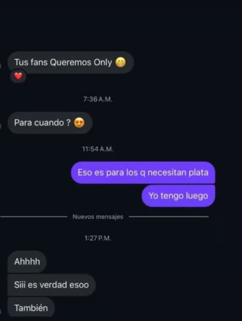 «Eso es para los que necesitan plata», respondió sin titubeo la ex modelo. Y para que no queden dudas, agregó: «Yo tengo luego». Muchas faranduleras encontraron últimamente una buena manera de generar ingresos a través de OnlyFans.