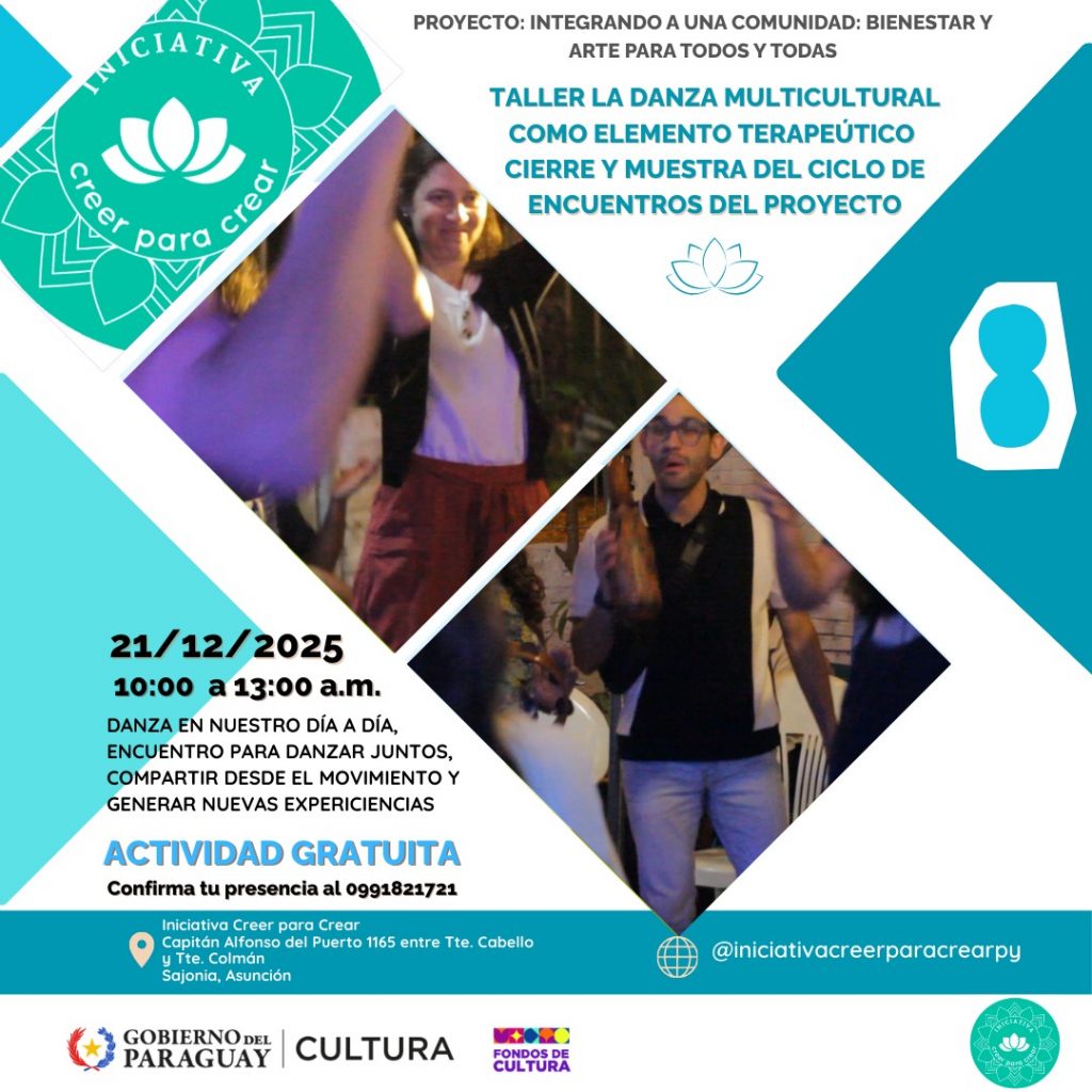 Este ciclo de 8 talleres de bienestar y arte para la comunidad, que inició el pasado 6 de diciembre y continúa con actividades los días 20 y 21 de diciembre, se desarrollará en el local de la Iniciativa Creer para Crear, ubicado en Capitán Alfonso del Puerto 1165, barrio Sajonia, Asunción.