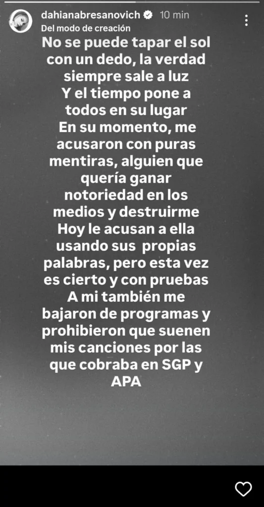 “No se puede tapar el sol con un dedo, la verdad siempre sale a la luz y el tiempo pone a todos en su lugar. En su momento, me acusaron con puras mentiras, alguien que quería ganar notoriedad en los medios y destruirme”, fue lo que posteó Dahiana Bresanovich en su historia de instagram.