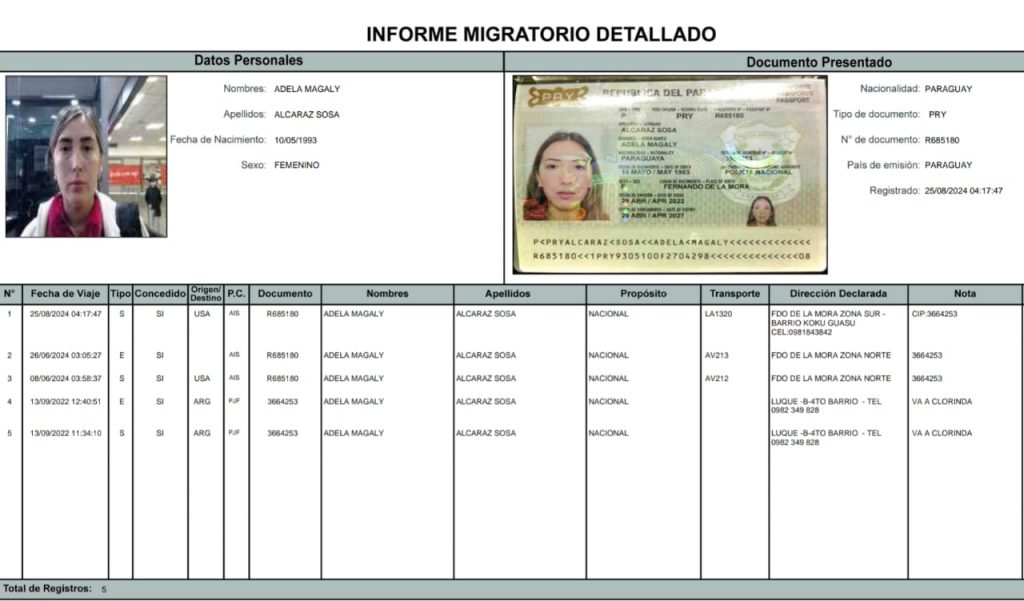 El segundo caso afecta a Adela Magaly Alacaraz Sosa, quien desde 2023 figura como Asesor Técnico – Asistente en la comuna. Su carga horaria obligatoria es de lunes a sábado, pero desde agosto de 2024 se encuentra definitivamente en Estados Unidos y no ha regresado al país. Pese a ello, continúa cobrando mensualmente, generando un perjuicio de 113.975.880 guaraníes.