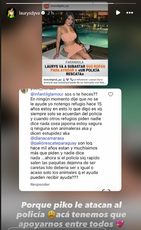 Nuestro post en Instagram sobre esa iniciativa, con el título «Laurys va a subastar sus ropas para ayudar a ‘Un Policía Rescata’, generó muchos comentarios y uno de ellos cuestionaba el apoyo a un policía, que los que realmente se merecen son Diana Camarasa y Pako Rescate. Laurys copió el posteo y el comentario y compartió en su historia pidiendo que no le ataquen al policía. «Acá tenemos que apoyarnos entre todos», dijo.