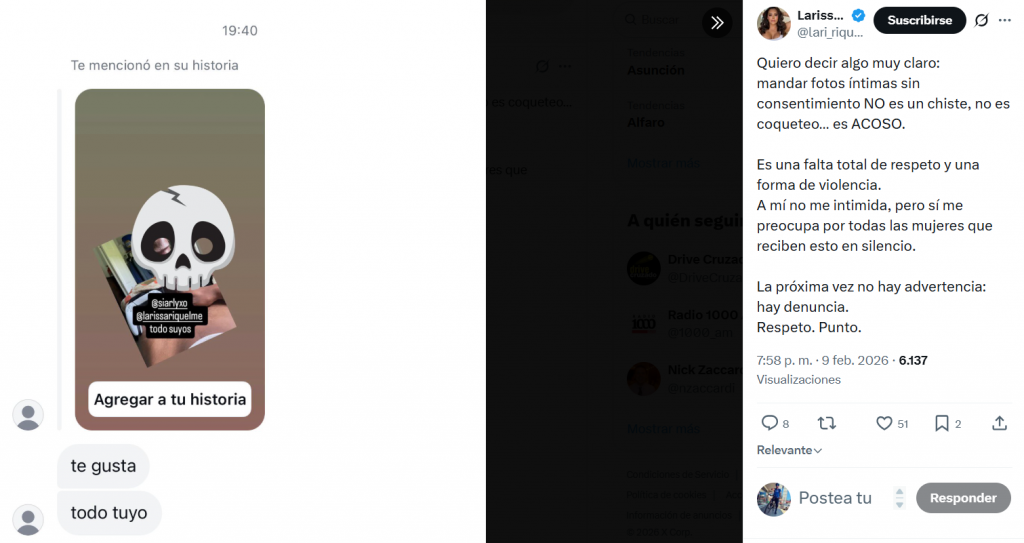 «Quiero decir algo muy claro: mandar fotos íntimas sin consentimiento NO es un chiste, no es coqueteo… es ACOSO», escribió Larissa.