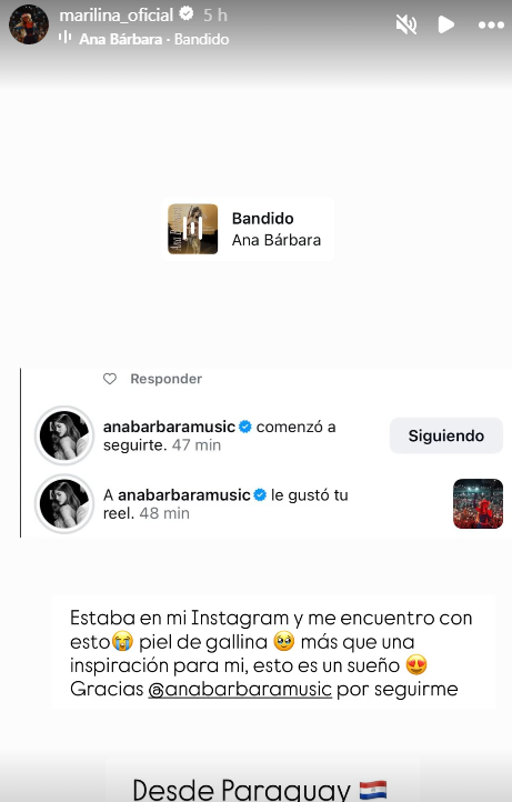 Marilina llegó a hacer covers de canciones de Ana Bárbara, como de Bandido, por ejemplo. «Estaba en mi Instagram y me encuentro con esto, me da piel de gallina. Más que inspiración para mí, esto es un sueño… Gracias @anabarbaramusic por seguirme», escribió la villarriqueña al compartir en su historia el «screen» donde se ve que le mexicana empezó a seguirle y le dio «Me Gusta» a su reel de un show.