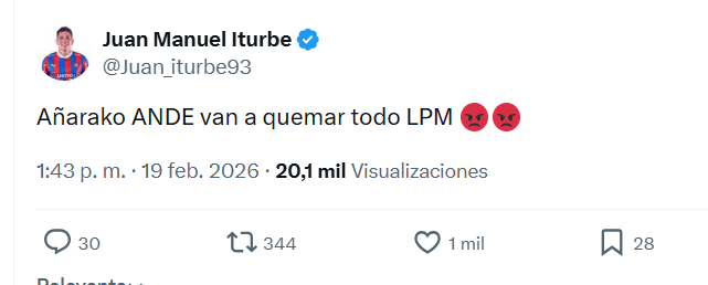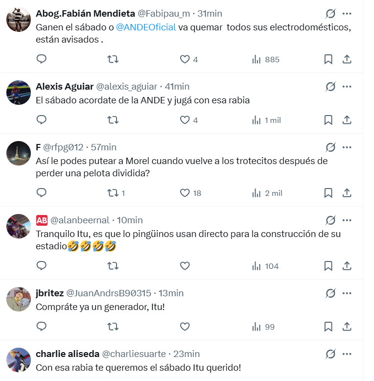 «Añarako ANDE, van a quemar todo LPM», escribió en su cuenta de X y en minutos encendió a sus seguidores que le dejaron todo tipo de comentarios. En su mayoría fueron cerristas los que le escribieron que entre con esa misma rabia el sábado en el clásico.