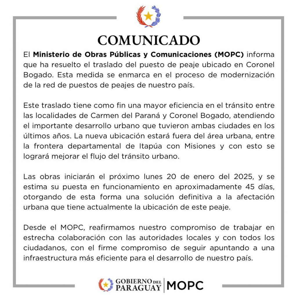 El Ministerio de Obras Públicas y Comunicaciones (MOPC) anunció la resolución para iniciar el proceso de reubicación de la estación de peaje de Coronel Bogado, sobre la Ruta PY01, con el objetivo de concretar el traslado en el ejercicio fiscal 2025.