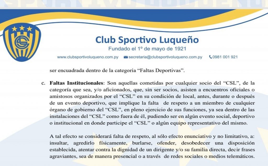 El Consejo Ejecutivo del club aprobó un nuevo estatuto social, propuesta por el Consejo Disciplinario, que establece alguna sanción para los socios que se burlen o tengan un «comportamiento irrespetuoso» hacia «un miembro de cualquier órgano de gobierno del Sportivo Luqueño».