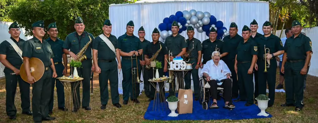El Ejército paraguayo ofreció una serenata de la banda militar, con la presencia del ministro de Defensa, Óscar González. El veterano soldado, que fue sargento primero, se mostró muy feliz y listo para celebrar una fecha tan importante en su vida.