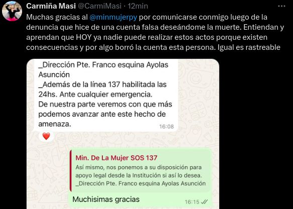 Hoy, Masi agradeció la pronta respuesta del Ministerio de la Mujer, que le ofreció apoyo y acompañamiento conforme al protocolo para este tipo de situaciones. Además, destacó que el autor de la amenaza ya había borrado su cuenta, pero advirtió que «es rastreable» y que no quedará impune. «Hoy nadie puede realizar estos actos sin consecuencias», remarcó, dejando abierta la posibilidad de formalizar la denuncia y rastrear al responsable hasta dar con su identidad.