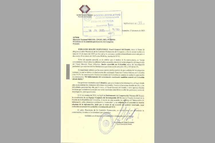 El fiscal general del Estado, Dr. Emiliano Rolón Fernández, presentó una nota ante la Comisión Permanente del Congreso, en la cual hace referencia a los avances de la investigación sobre el asesinato del fiscal Marcelo Pecci Albertini. Dicha presentación obedece a que el fiscal general asistió al Congreso esta mañana, tras una convocatoria a sesión extraordinaria reservada, para la fecha, a las 09:00, la cual no se realizó por falta de quorum.