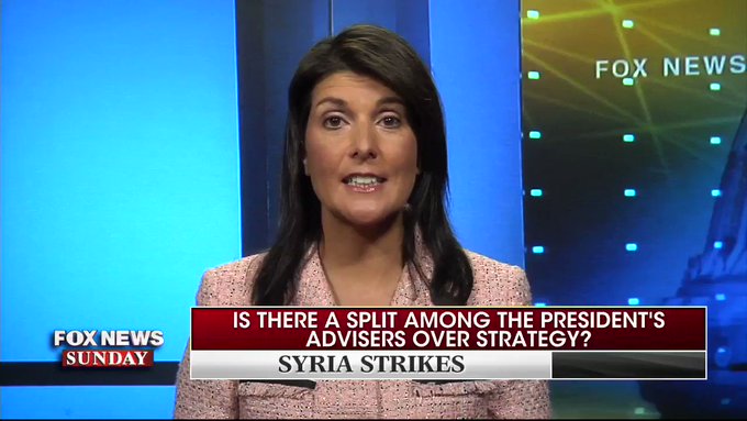 Hablando en Fox News Sunday, Haley enumeró tres objetivos para Estados Unidos: asegurar que las armas químicas no se usen de ninguna manera que ponga en riesgo los intereses de Estados Unidos, que el Estado Islámico sea derrotado y que haya una posición ventajosa para observar lo que Irán está haciendo.