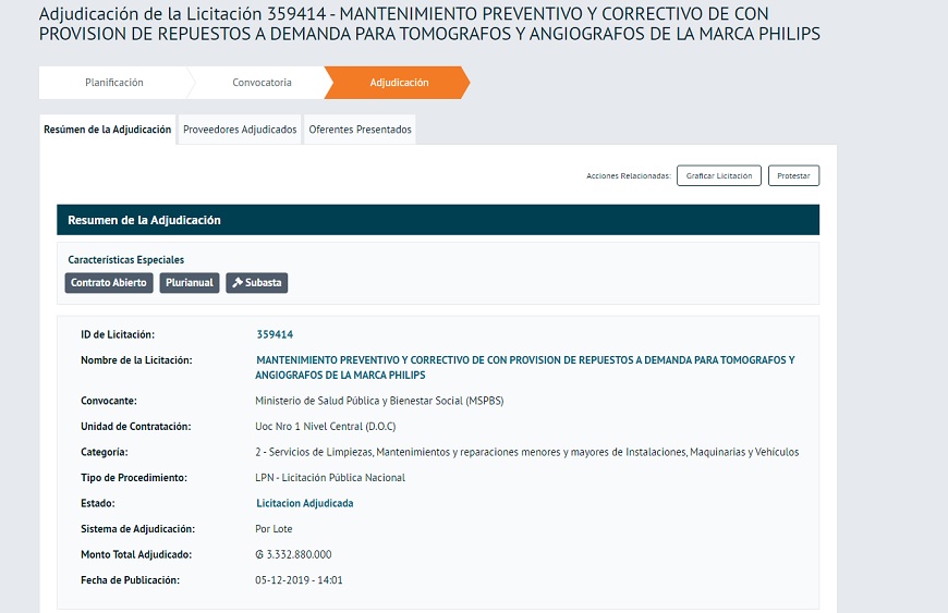 La licitación LPN SBE N° 28/2019 “Mantenimiento preventivo y correctivo con provisión de repuestos a demanda para tomógrafo y angiógrafo de la marca Philips”, fue lanzada en febrero de 2019 para garantizar el funcionamiento de equipos de diagnóstico por imagen ubicados en Encarnación, Pedro Juan Caballero, Caacupé y el INCAN. Este llamado, cuyo contrato se firmó en diciembre de 2019, se encuadró en los precios de referencia del mercado y siguió todos los pasos requerido por la legislación vigente, recibiendo el código de contratación de la DNCP el 16 de diciembre de 2019.