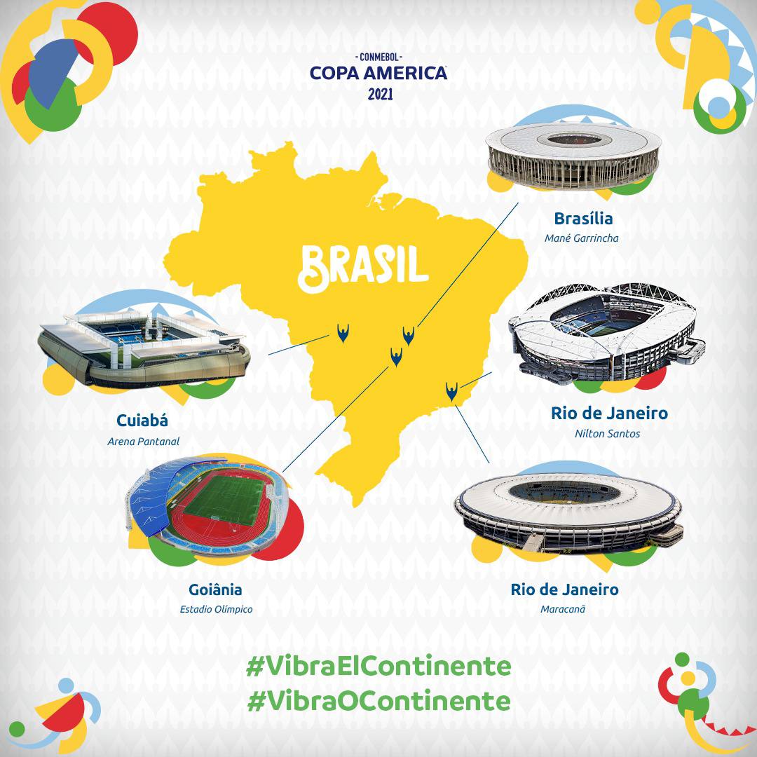 La Copa América Brasil 2021 se disputará en cinco estadios en cuatro ciudades, Brasilia, Goiania, Cuiabá, y Río de Janeiro.