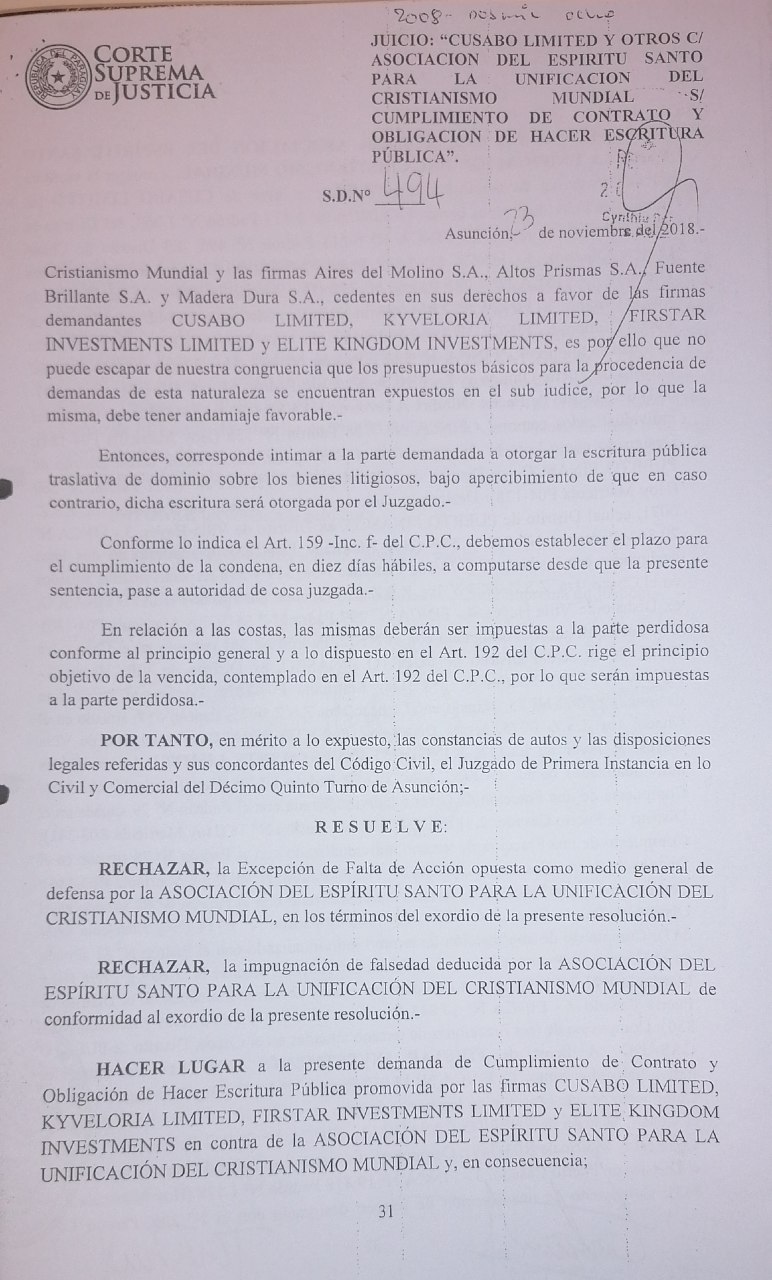 El polémico caso de la sentencia donde la Asociación del Espíritu Santo para la Unificación del Cristianismo Mundial es obligada a transferir 310.000 hectáreas de tierras del Chaco- protegidas por la Ley de Seguridad Fronteriza-a cuatro presuntas empresas offshore de capital extranjero le costó el cargo a la exjueza de Primera Instancia en lo Civil y Comercial de Asunción, Tania Irún. Documentos revelan llamativos hechos en el marco del proceso.